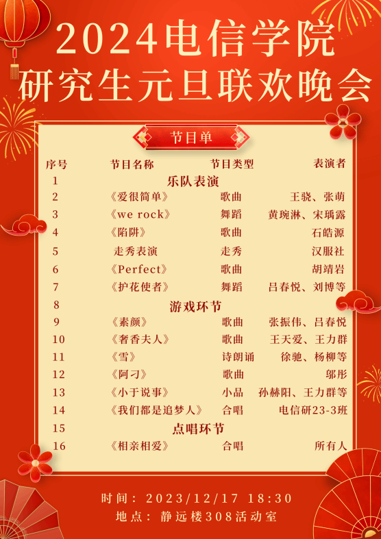 值此新春佳节来临之际,为丰富研究生课余文化生活,2023年12月17日晚18:30,公司党委研工部在静远308员工活动中心成功举办2024研究生元旦联欢晚会。出席本场晚会的嘉宾有伟德bevictor中文经理南敬昌教授、公司党委副书记王华老师、副经理翟雷应教授、副经理李蕾副教授及各位研究生导师、班主任。